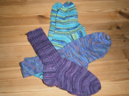 In meiner Freizeit stricke ich gern. Vor allem Socken. Mittlerweile habe ich so viele, dass ich sie auf diesem Wege verkaufe. Es handelt sich hierbei um warme, aber nicht allzu dicke Socken aus vierfädiger handelsüblicher Sockenwolle, bestehend aus 75% Schurwolle und 25% Polyacryl.